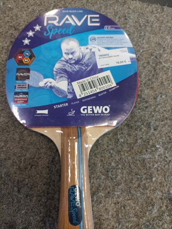 Kompletná raketa na stolný tenis vhodná pre ambiciózneho rekreačného hráča. GEWO RAVE SPEED má poťahy s 2,00mm hrubou špongiou ktorá dodáva drevu potrebnú rýchlosť a ovládanie. • pre začínajúcich alebo pokročilých rekreačných hráčov • poťah GEWO RAVER s 2,00mm špongiou ITTF schválené • zloženie 5 špeciálnych preglejkových dýh • systém GEWO SENSETISE - Grip zaručuje pevné uchytenie • váha okolo 180g