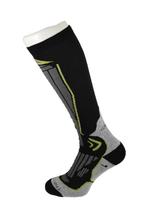 Tenký úplet z CoolMaxu (1) je dopĺňaný anatomicky tvarovanými časťami (5) na miestach dôležitých pre dokonalú kontrolu a ovládanie lyží. Súčasne je vytváraný tepelný komfort a zabezpečený odvod vlhkosti. Froté vankúš na špičke a päte (2) podporuje ochranu chodidla proti vzniku pľuzgierov. Elastické sťahovanie v chodidle (3) a nad členkom zabraňuje nežiadúcemu pootočeniu podkolienky pri aktívnom pohybe. Plochý šev na špici (4) ktorý netlačí. Elastický lem pod kolenom (6).