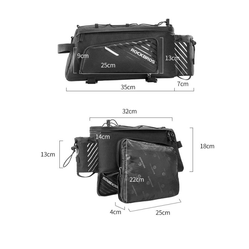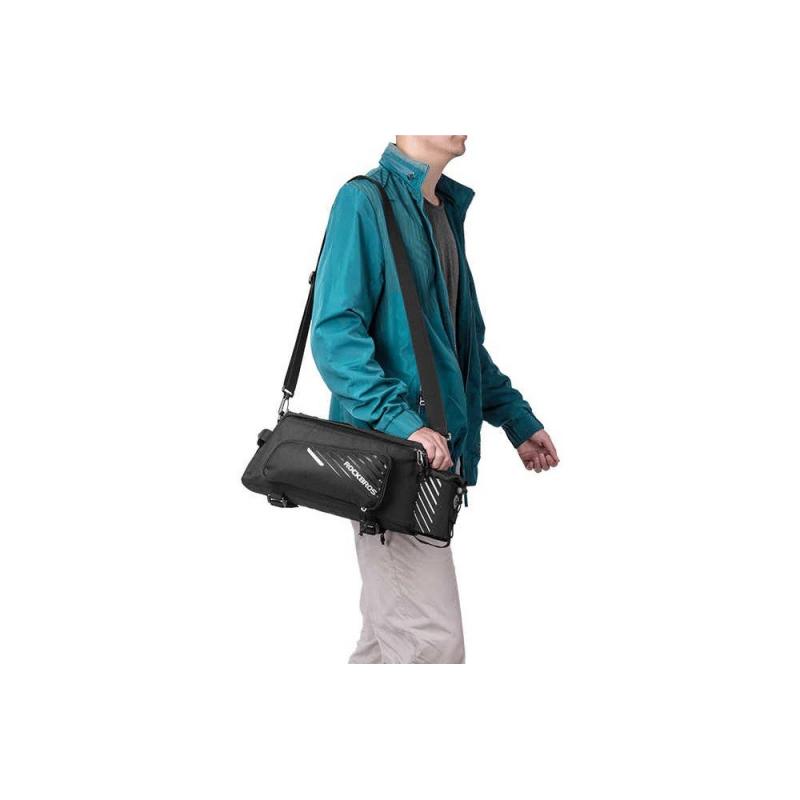 značka Rockbros, taška na bicykel je ideálna na dlhšie výlety na bicykli. Vďaka priloženému krytu proti dažďu je vhodný na použitie v akýchkoľvek podmienkach. Rozkladá sa (po stranách), nastaviteľný elastický popruh na hornej strane na prenášanie väčších predmetov, priestranné hlavné vrecko, objem: 10 l pred zložením, 12 l po zložení. Zapínanie na suchý zips. Vrecko na fľašu so sťahovacou šnúrkou na zadnej strane, Reflexné prvk, Ďalšie vrecká vo vnútri tašky (vrátane jedného zo sieťoviny). Držiak na pripevnenie napr. svetla na bicykel na zadnej strane, kryt proti dažďu na tašku je súčasťou balenia, možnosť nosenia tašky na ramene, hmotnosť: 665 g, materiál: 100% nylon