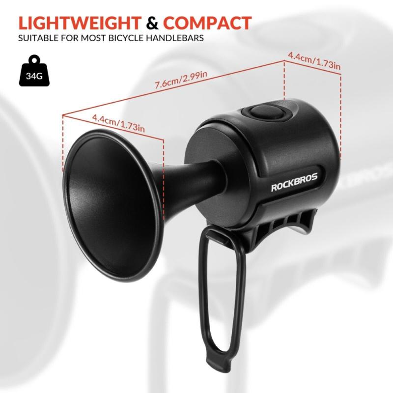 Značka Rockbros, Elektrický klaksón na bicykel, kolobežku, 120 dB, pre dospelých aj deti, batéria 2 x CR2032, krytie: vodotesný IPX4. Jednoduchá montáž a demontáž. Zvonček sa hodí pre riadidlá s priemerom 2,2-3,2cm. Produkt je dodávaný s dvoma rôznymi veľkosťami rozťahovacích silikónových remienkov, ich pripevnenie alebo uvoľnenie z riadidiel bicykla trvá menej ako 10 sekúnd.