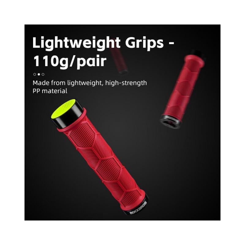 značka Rockbros, materiál špeciálna dvojzložková zmes, prvá tvrdý plast vo vnútri pre dobré spojenie s riadidlom, druhá vonkajšia TPR kratón, mäkká zmes pre komfort a tlmenie nárazov, ukončenie rukoväte duralovou zátkou s odrazkou, farba červená, dĺžka 137 mm, jednoduché uchytenie na riadidlo pomocou imbusovej skrutky na objímke, balené v krabičke Rockbros