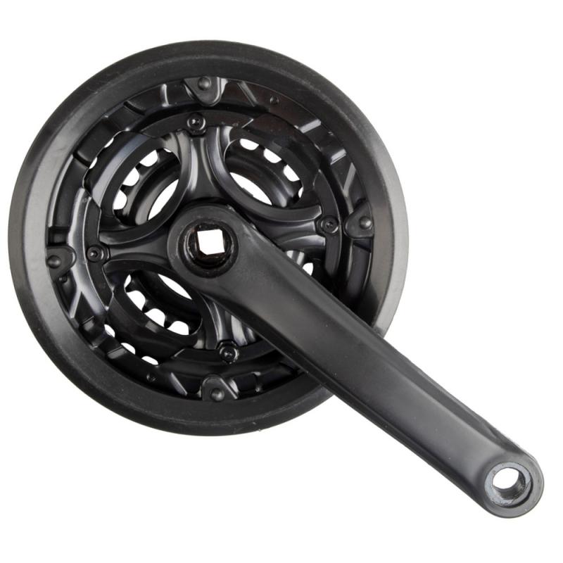 trojprevodník, materiál oceľ, 170 mm kľuky potiahnuté plastom, farba čierna, počet zubov 24/34/42, najmenší prevodník vypuklý, nitovaný, s krytom reťaze, pre štvorhrannú 119 mm osku