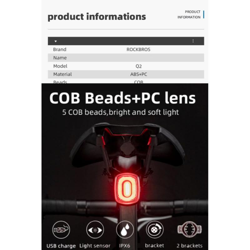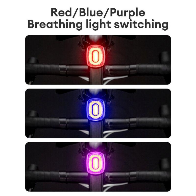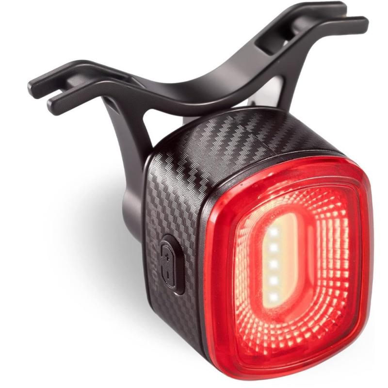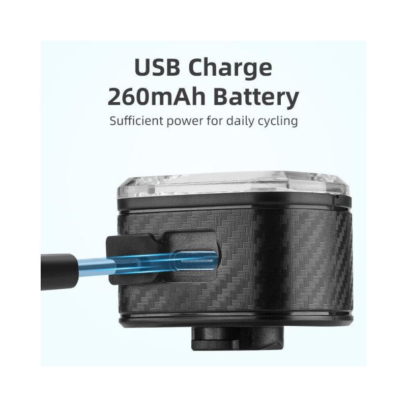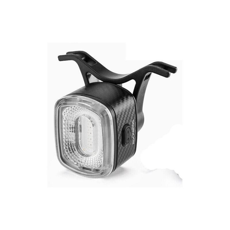 značka Rockbros, Zadné USB nabíjateľné svetlo, karbónový dizajn, 5 funkcií – pomalé blikane, rýchle blikanie, dýchanie 3farbami(červená,fialová,modrá), stroboskopické blikanie 3 farbami(červená,fialová,modrá), trvalé svietenie + 3 úrovne intenzity svetla ( dlhé kliknutie počas zapnutia svetla ), vodotesné, COB LED, batéria 260 mAh polymér. Montovateľné na sedlovku, alebo na lyžiny sedla. Čas nabíjania cca 2 hod. Čas svietenia 7 – 54 hod. Krytie IPX6. Materiál ABS+PC.Pracovná teplota -10C až +60C. Hmotnosť 19 gramov.