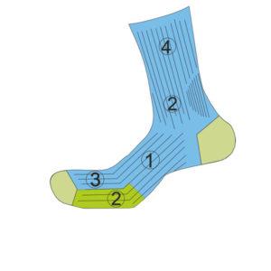 Špeciálna konštrukcia (1) a tlakové zóny (2) podporujú prúdenie krvi vo svaloch a umožňujú rýchlejšie odbúravanie kyseliny mliečnej a tým urýchľujú regeneráciu a zvyšujú výkon. Charakteristický je gradujúci tlak, najsilnejší vytvára úplet v oblasti chodidla a členku, smerom nahor tlak postupne slabne. Tým je podporované prúdenie krvi smerom do srdca, čím sa krv ľahšie okysličuje Plochý šev (3) ktorý netlačí. Elastické prispôsobenie sa a obopnutie nohy (4).