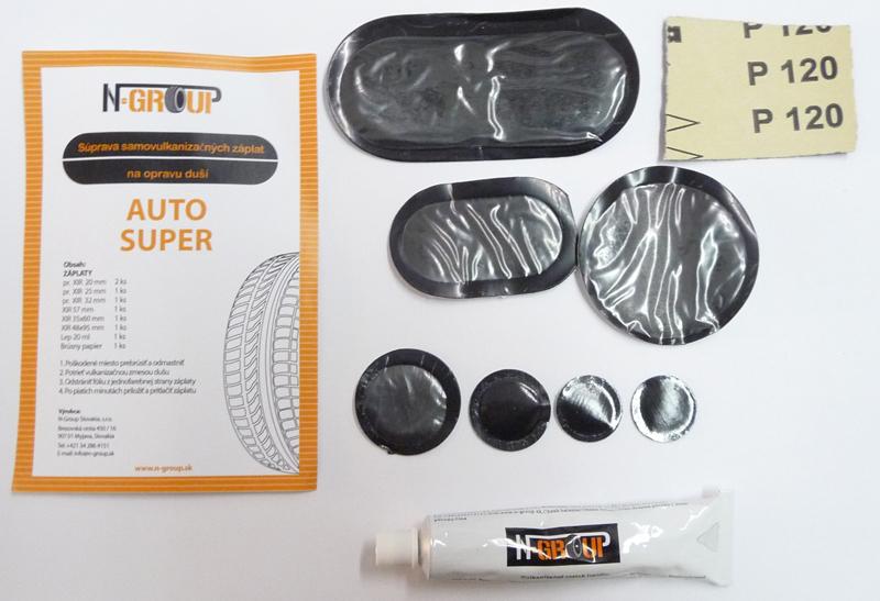 Sada na opravu defektov dušových pneumatík - lepenie duší. Sada obsahuje záplaty, lep, brúsny papier na zdrsnenie povrchu duše.