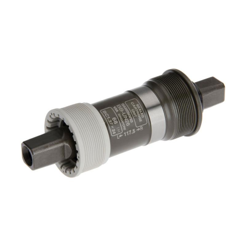 Zapuzdrená štvorhranná stredová oska BB-UN26, dĺžky 117mm, anglický závit BSA, bez upínacích skrutiek pre kľuky. Pre šírku rámu 68mmTyp: MTB, Celková váha balenia: 331g, Dĺžka/Priemer: 68x117,5mm, Spôsob montáže: BSA, Square, šedá/čierna, bez skrutiek, Materiál: Oceľ / Plast