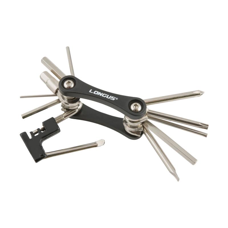 Kompaktná sada náradia POLY 12, ktorá obsahuje všetko potrebné pre opravu, či nastavenie bicykla. Sada obsahuj šesťhran 2; 2,5; 3; 4; 5; ;6; 8; plochý a krížový skrutkovač, T25, centrovací kľúč a nitovač reťaze.Materiál: Cr-V oceľ