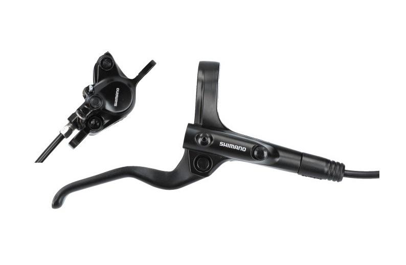 Kotúčová brzda MT201. Zložená z brzdovej páky BLMT201 a strmeňa BRMT200 bez adaptéra, spojená hadicou BH59-SS. Platničky-resin B01S.
